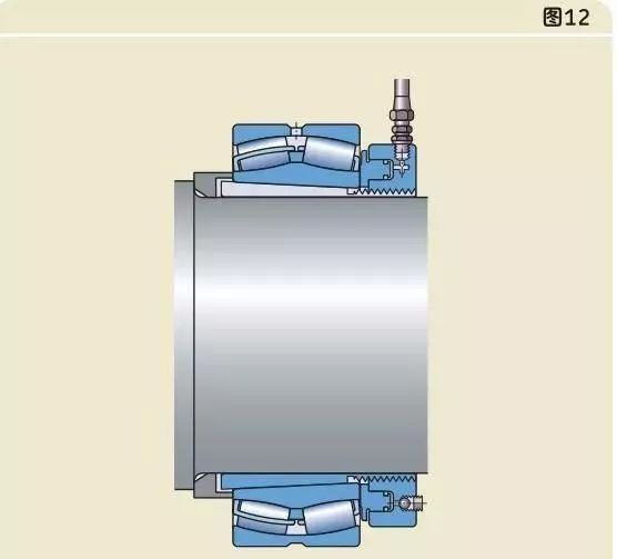 较大轴承需要更大的力来安装,因此应使用液压螺母。液压螺母可以把圆锥孔轴承安装在圆锥形轴径上(图11),紧定套上(图12),退卸套上(图13)。